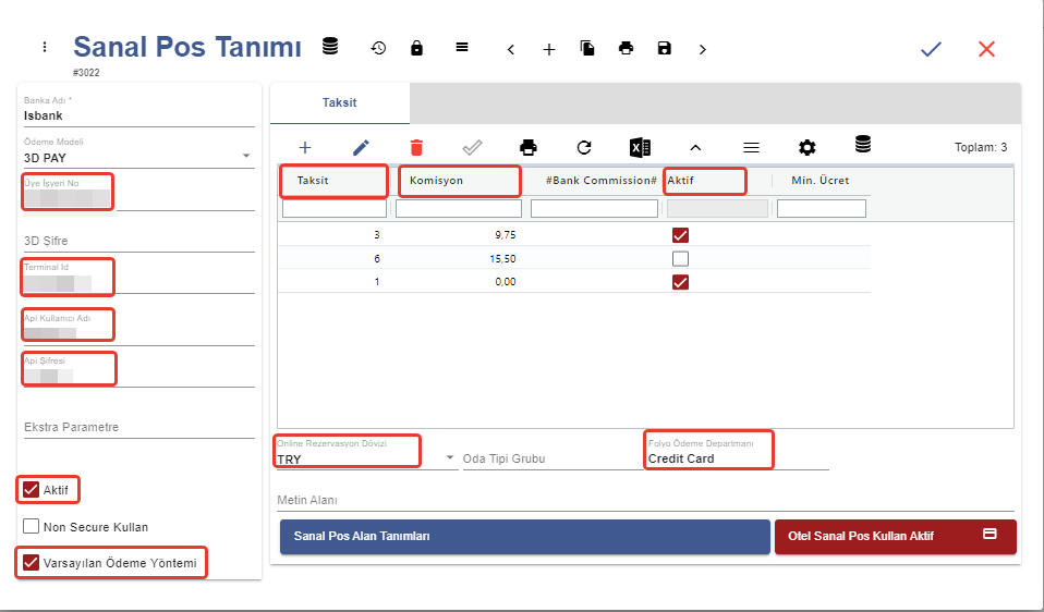 * Tanımlanan sanal pos için aktif parametresi işaretli olmalıdır. \