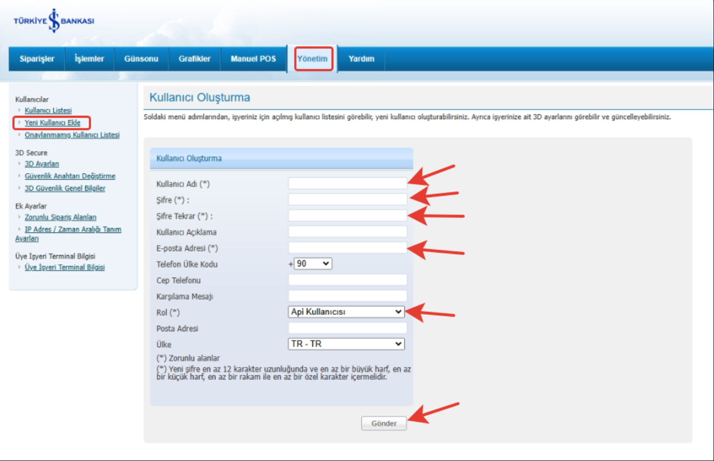 İş bankası sanal pos ekranında **“Yönetim > Yeni Kullanıcı Ekle”** sayfasından api kullanıcısı oluşturulmalıdır.  Oluşturulan api kullanıcı adı ve şifresi Elektraweb sanal pos ekranında api kullanıcı adı ve api şifresi alanına yazılmalıdır.\