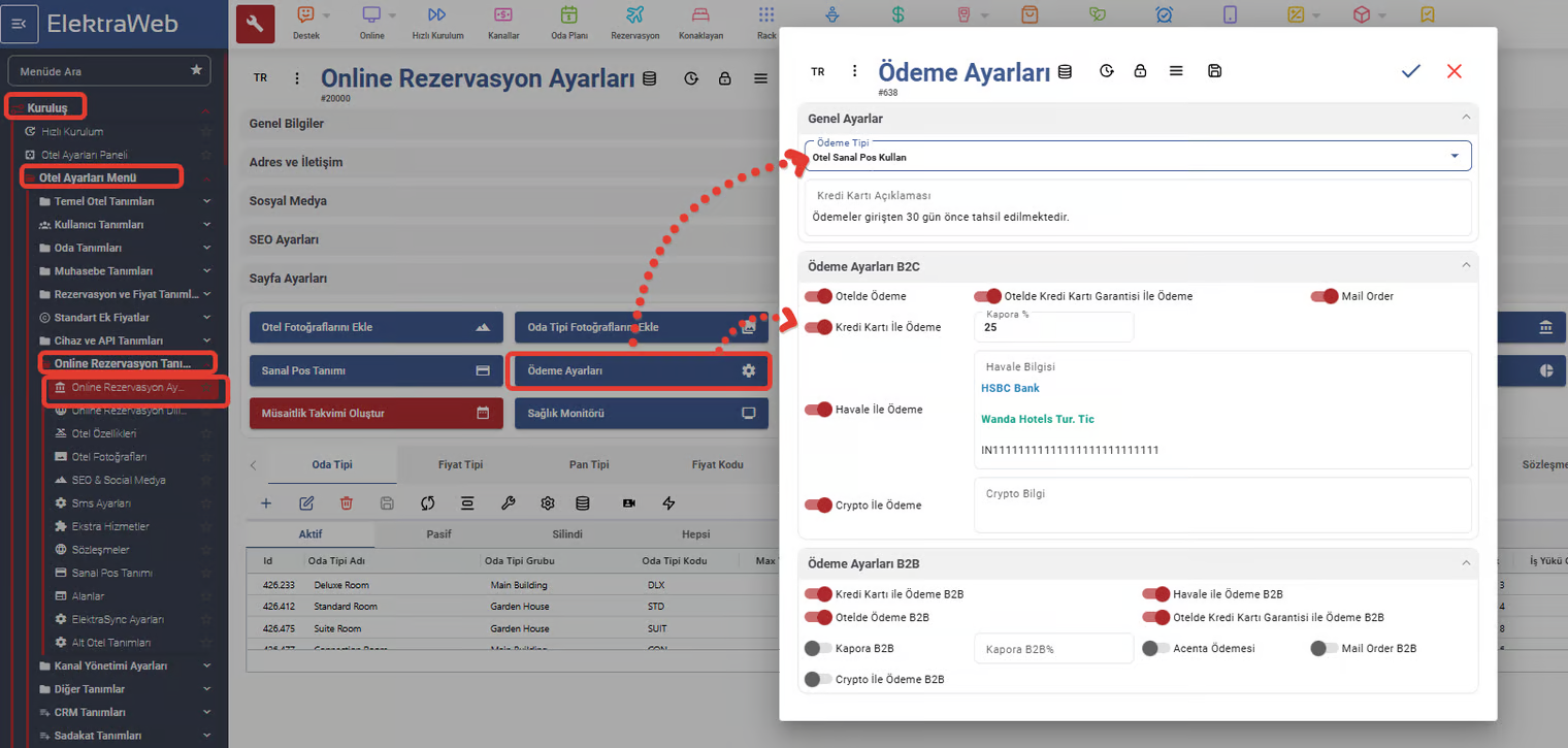 * &#x20;[**Ödeme Ayarları** ](https://app.elektraweb.com/app/record/hotel-settings-forprices)ekranında **“Kredi Kartı ile Ödeme ve Otel Sanal Pos Kullan”** seçenekleri aktif olmalıdır.