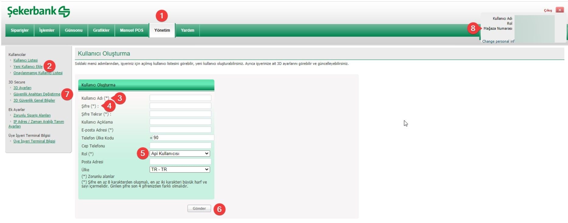 Şekerbank sanal pos ekranında **“Yönetim > Yeni Kullanıcı Ekle”** sayfasından api kullanıcısı oluşturulmalıdır.  Oluşturulan api kullanıcı adı ve şifresi Elektraweb sanal pos ekranında api kullanıcı adı ve api şifresi alanına yazılmalıdır.\