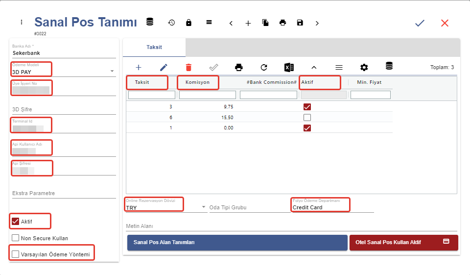 * Tanımlanan sanal pos için aktif parametresi işaretli olmalıdır. \